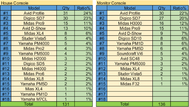 通常我們可以把目光投注在每個項目的前五名機種,因為他們被採用率加總多半超過年度總場次的70%以上。我如果是專門承接這種巡迴演唱會的PA公司老闆,當然把錢投資在前5名的Console上了,中獎率超高呢。