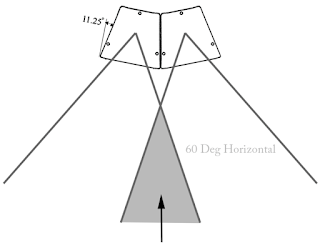水平併接喇叭須注意,喇叭的兩側外觀切角與真正的喇叭水平涵蓋角度是無關的,而且往往涵蓋角度大於外觀切角。所以如果直接以兩個喇叭的側邊靠攏併接,往往會在兩喇叭間產生共同涵蓋交集的區域(圖中灰色區),雖然交集區域能量會累加,但也相對因為時間差的關係、帶來Comb Filter的干擾、抵銷某些頻率能量。然而因為喇叭靠得很近、產生的時間差很小,往往影響的都是較高頻率的能量抵銷與涵蓋不均的問題。