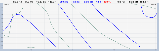 再重新量測,delay補償後、DXR15的phase曲線,可以看到DXR15的淺綠色phase曲線在十字標80Hz左右完全貼合到DXS15的藍色曲線上,而且一路到140Hz左右、兩者的phase誤差都維持在60°內,對於交集頻率帶的能量疊加,兩者回到正向有利的狀態。